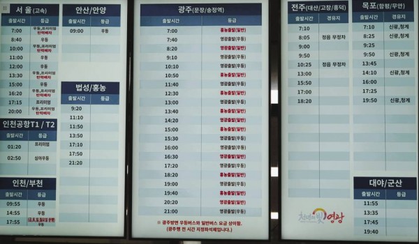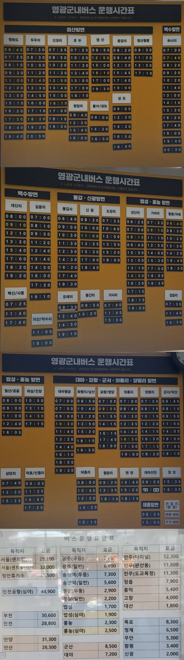 영광군 버스터미널 시간표 / 영광관내 및 서울,안양,광주,전주,목포 등 (2023년 4월 21일 기준)